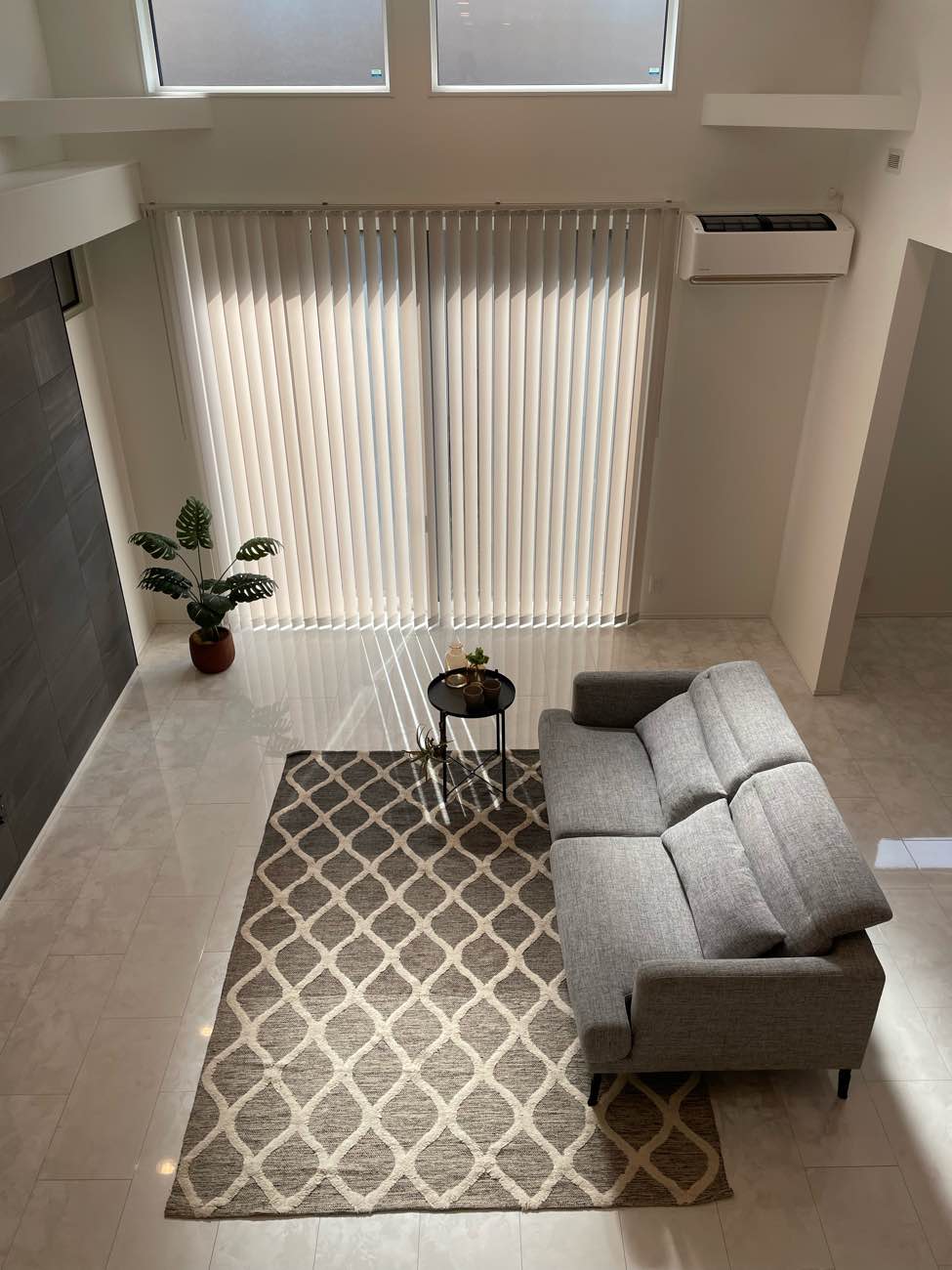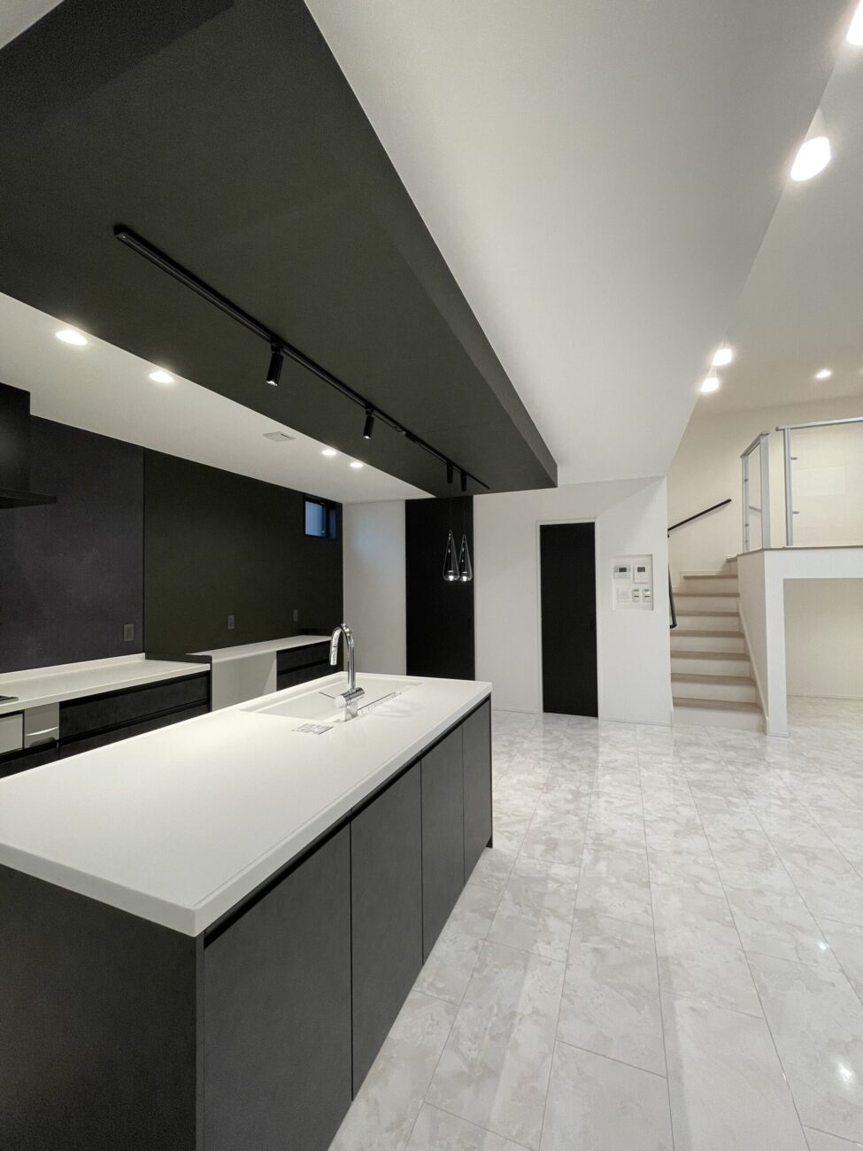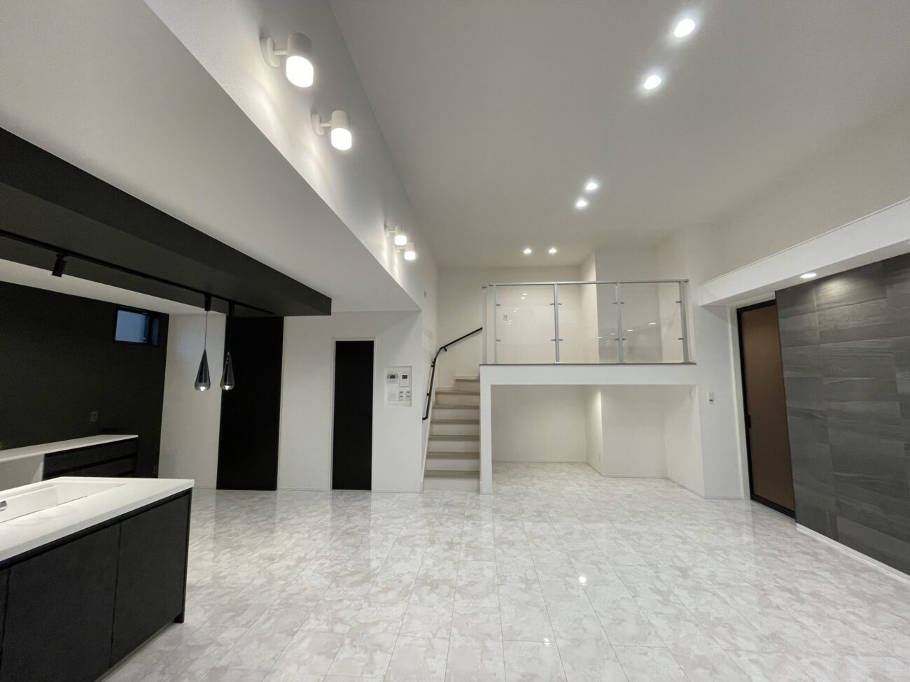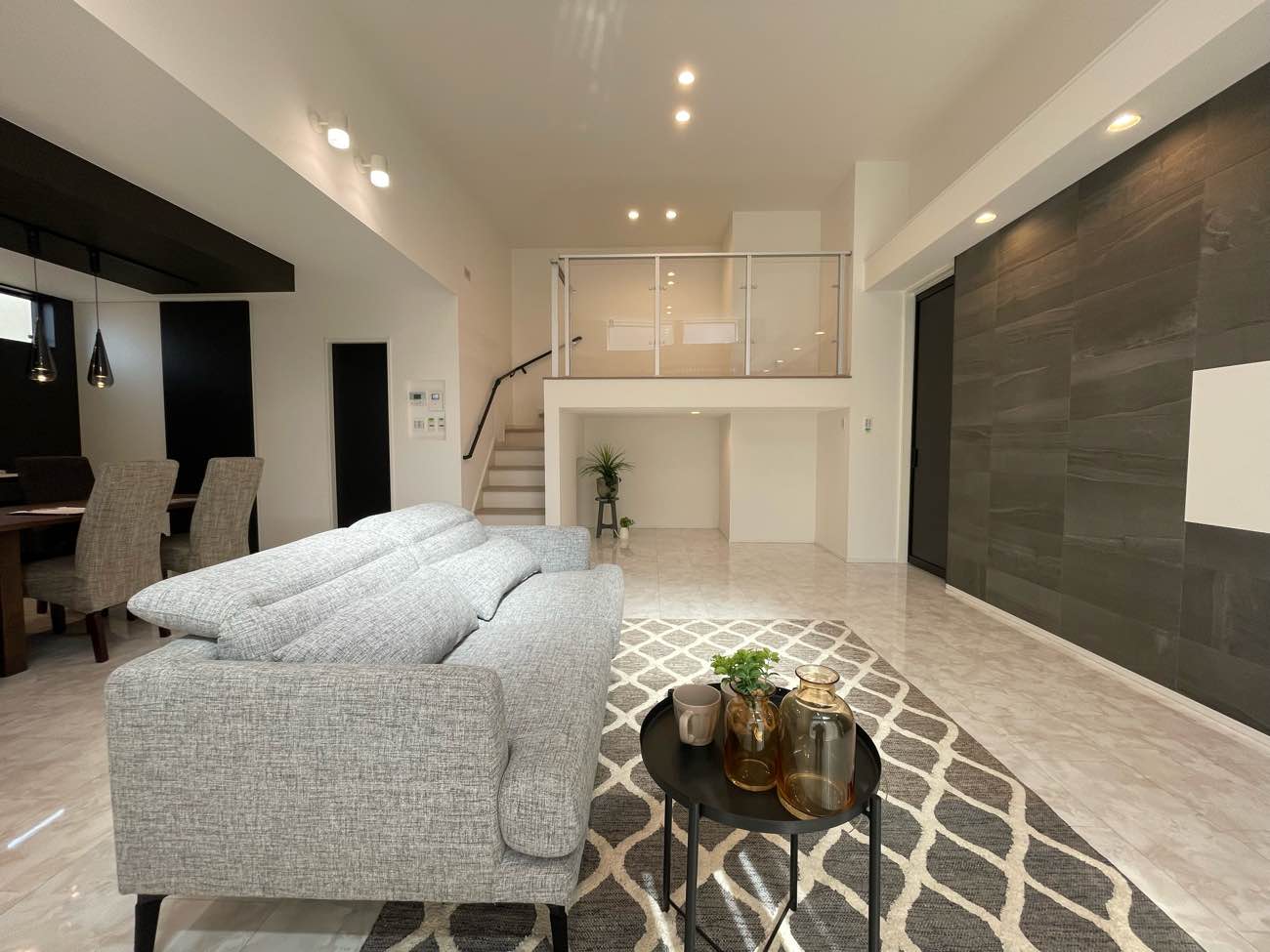 完成したのは、視線が抜ける大空間LDKに、ガラス手すりのスキップフロアが映える住まい。