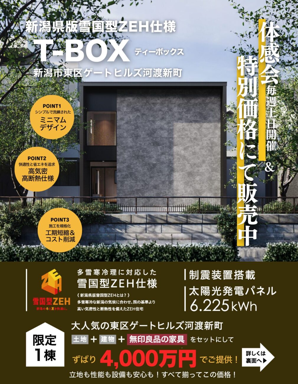 多雪寒冷地に対応した雪国型ZEH仕様となっており、さらに、制振装置搭載、オール電化、太陽光パネル 6.225kWh、エアコン2台、外構工事一式、無印良品の家具インテリアを含めて、土地代込みで4,100万円(税込み/別途諸経費)での提供となります。