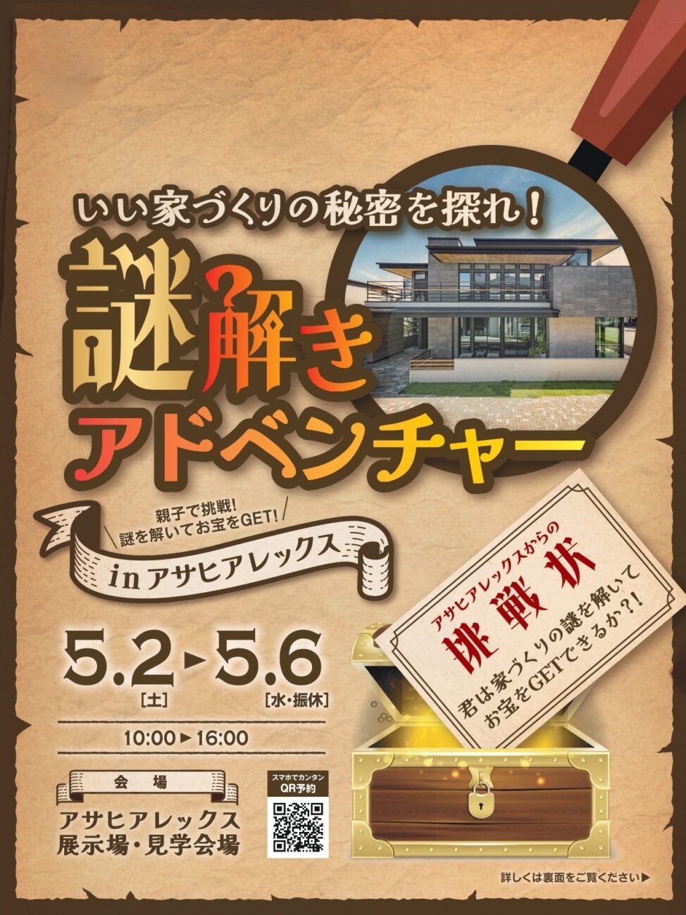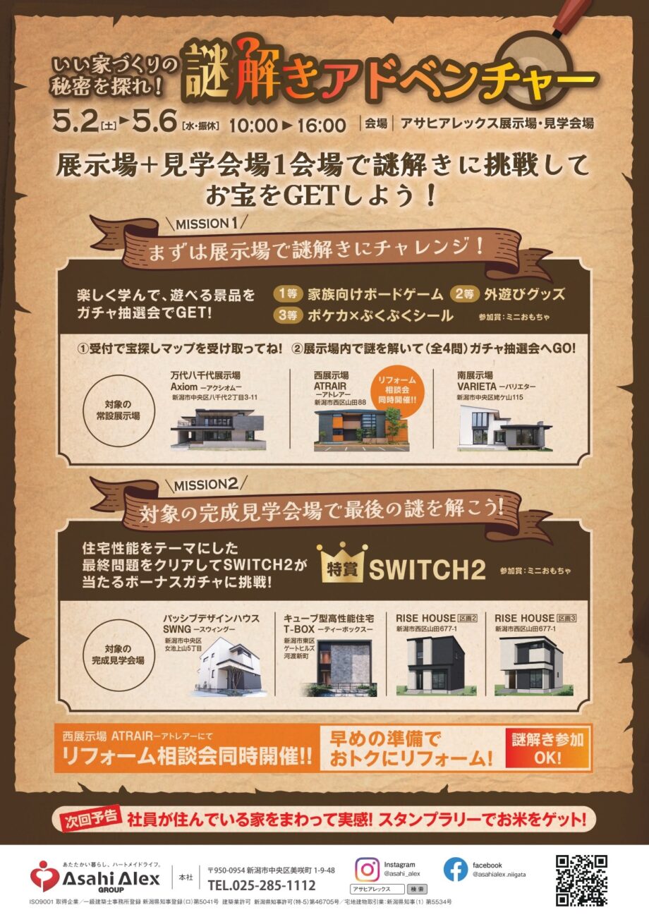 アサヒアレックスの展示場・見学会場が、5月のGWに謎解きアドベンチャーの舞台に。宝探しマップを手に謎を解き進めると、豪華景品のガチャ抽選会に挑戦できる!